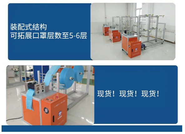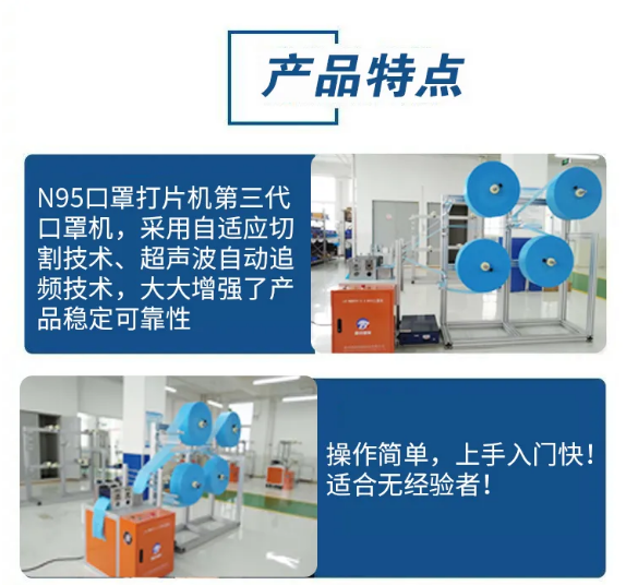N95口罩機【第三代增強穩定型】 型號:LB-MMN95-3.0 產量:40-70片/分鐘,6-10萬片/天 電壓:220V 功率:3300W 尺寸:2.6*0.9*1.8M 重量:200KG 層數:4層,裝配式機架,方便增加卷盤,可以支持5層,6層 設備組成: N95口罩打片機(含鼻梁條機) N95口罩封邊機 N95口罩耳帶焊接機
