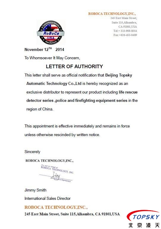 北京凌天成為美國ROBOCA公司在亞太區(qū)的總代理, 美國ROBOCA公司是反恐,救援裝備的制造商,主要產(chǎn)品包括氣動(dòng)支撐系統(tǒng),雷達(dá)生命探測儀,排爆機(jī)器人等.